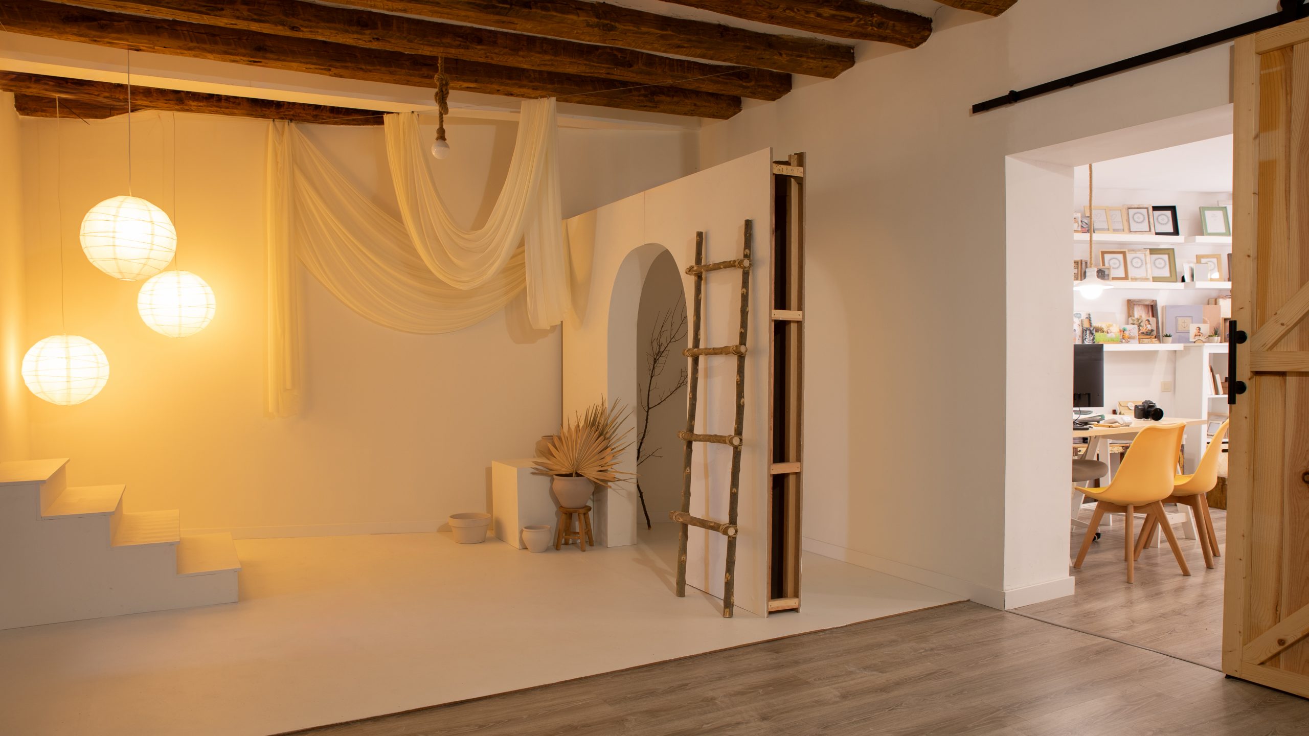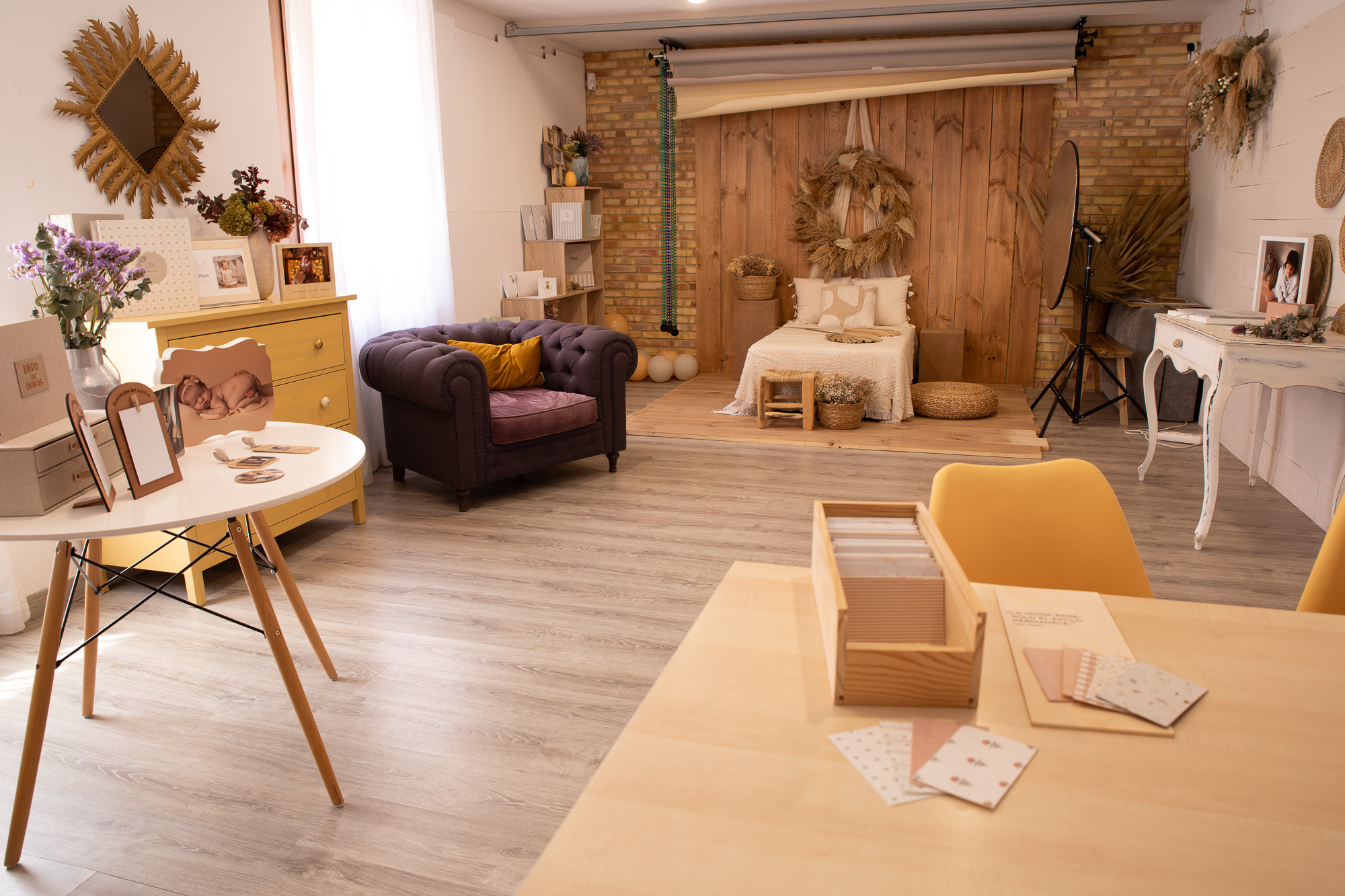 El estudio cuenta con dos salas grandes y diáfanas que me permiten montar y desmontar escenarios para cada sesión o campaña, un vestidor para la comodidad sobretodo de las sesiones de embarazo y de comunión donde también guardamos cantidad de atrezzo para nuestras sesiones, todo está pensado para crear el ambiente perfecto para las necesidades de cada cliente.
